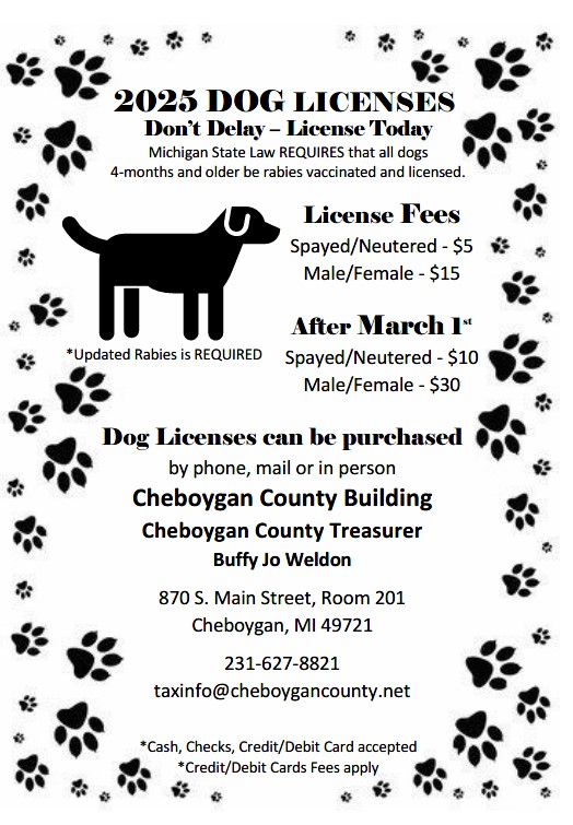 State Act 339 of 1919 requires all dogs 4 months old or over to have a license. Licenses are available December 1st for the following year. Licenses expire December 31st each year. Proof of up-to-date Rabies vaccination must be provided with application. Rabies vaccination must not expire within 30 days of application.